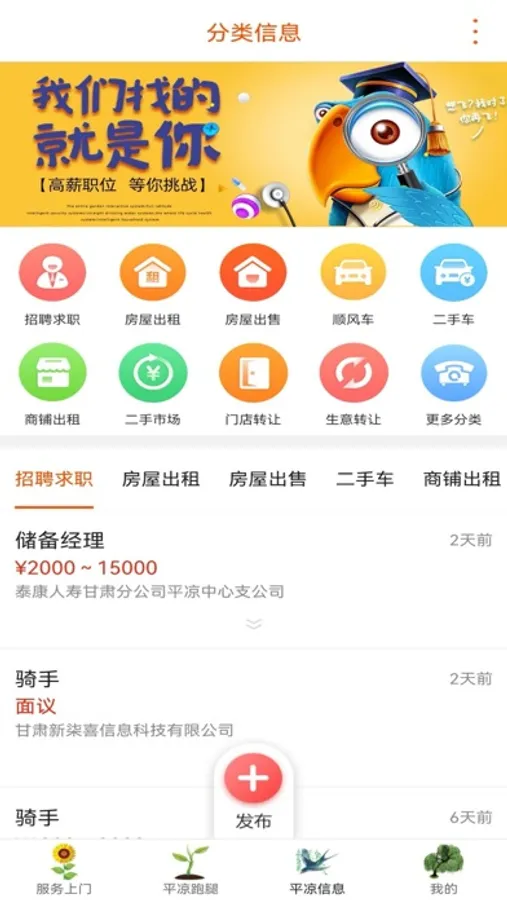 平凉海量信息免费查询或发布。招聘求职,房屋出租,房屋出售,顺风车,二手车,商铺出租,二手市场,门店转让,让您生活更简单!更多功能敬请期待!