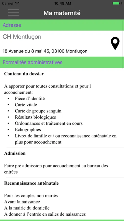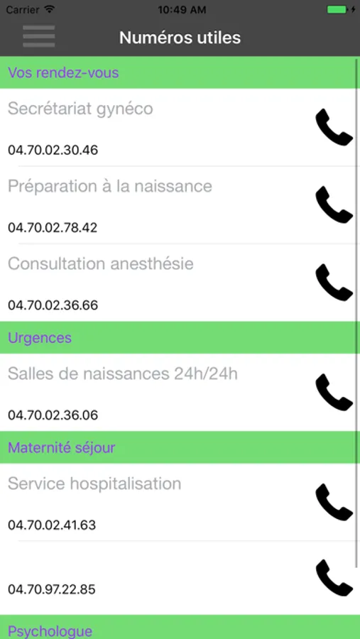 - une liste des numéros utiles de l’établissement (secrétariat maternité, médecins..) et des numéros à appeler en cas d’urgence.