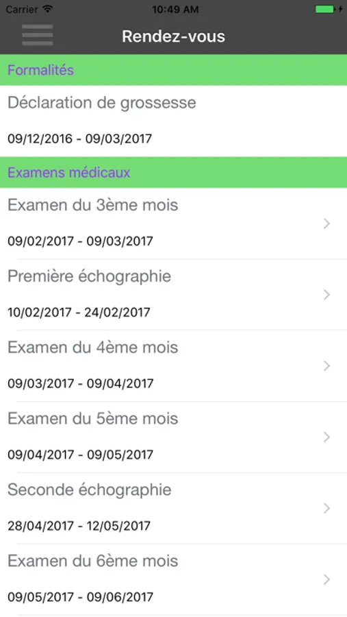 - un calendrier de grossesse : formalités à effectuer (déclaration grossesse …). Les rendez-vous à prendre pour les consultations , les examens, les écographies obligatoires. La gestion de ces rendez-vous : une liaison avec le calendrier du smartphone et une alerte pour ne pas oublier le rendez- vous.