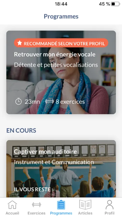 Grâce aux résultats de votre analyse vocale, retrouvez nos recommandations au travers d’un programme adapté à vos besoins. Cette évaluation est réalisée avec des partenaires spécialistes dans le domaine de la voix.