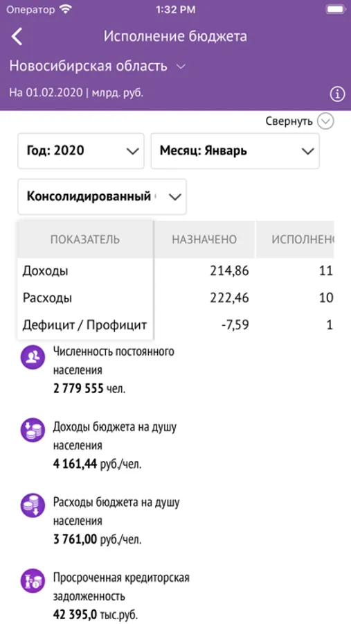В приложении «Открытый бюджет Новосибирской области» представлена актуальная официальная информация, которая позволяет анализировать экономическую, финансовую и социальную сферы Новосибирской области по данным Минфина России, Казначейства России, Росстата, ФСТ России, Минспорта России, Роспотребнадзора, а также по сведениям иных федеральных и региональных органов исполнительной власти и местного самоуправления.