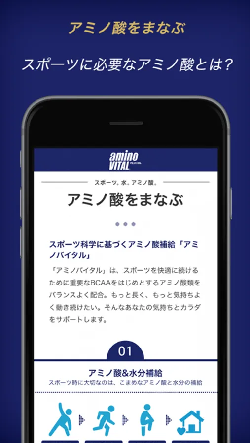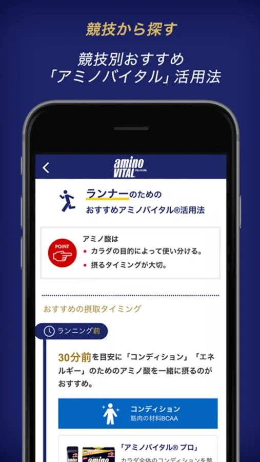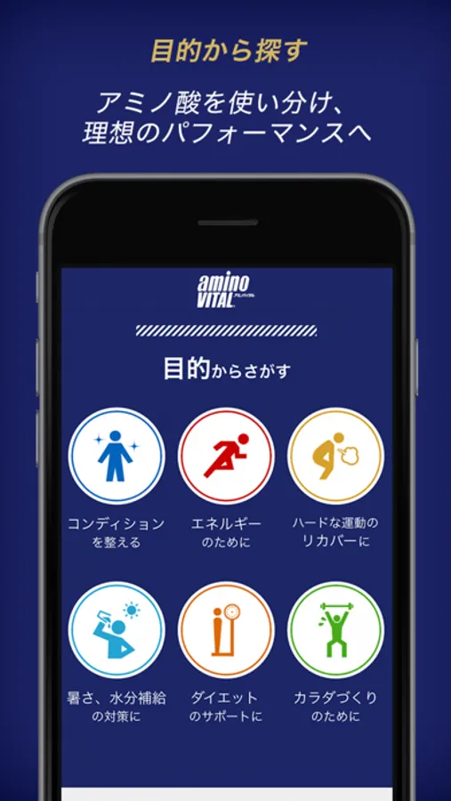 「シリーズから探す」「カラダの目的から探す」「競技から探す」から、あなたにぴったりの「アミノバイタル」が探せます。