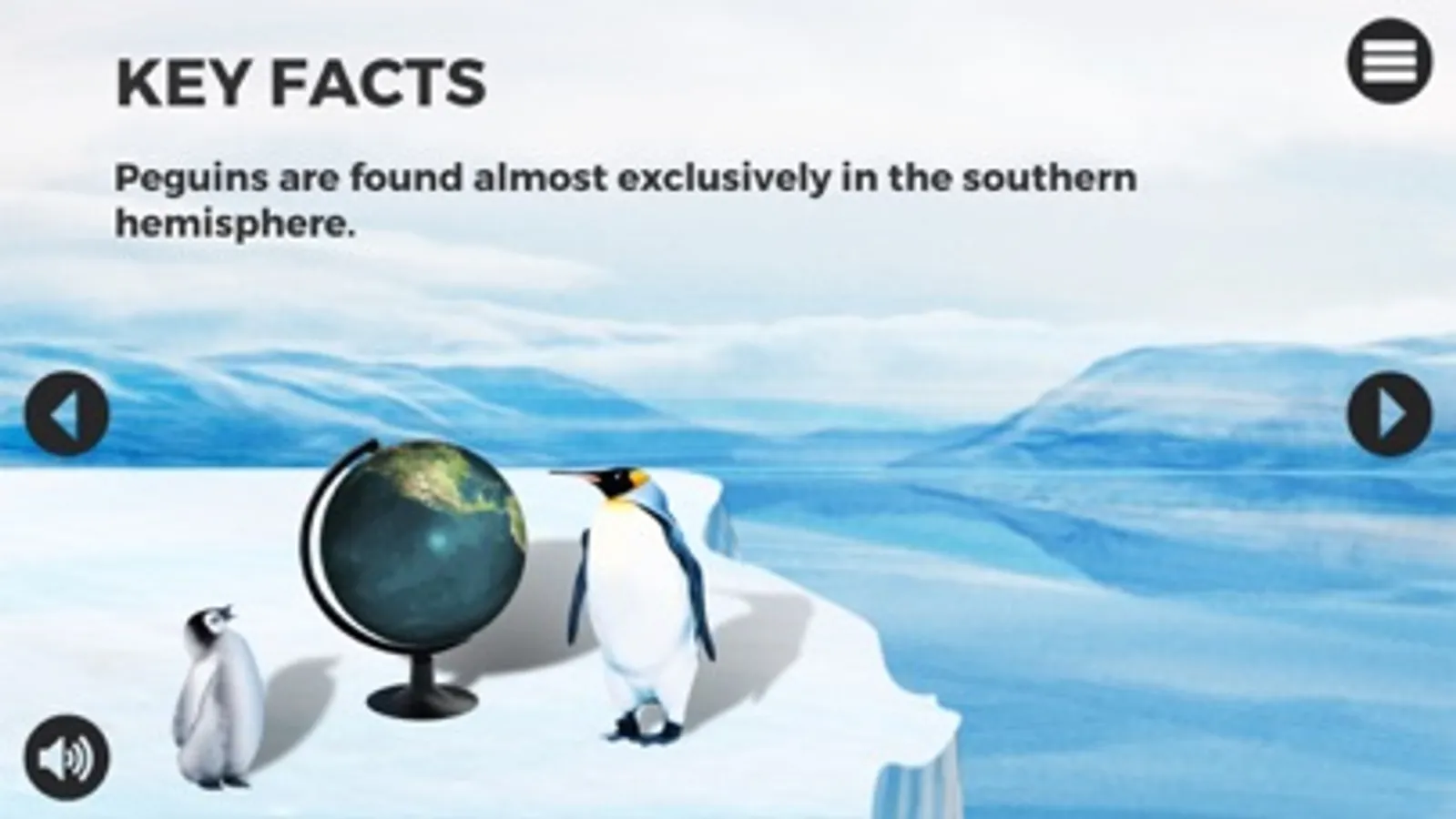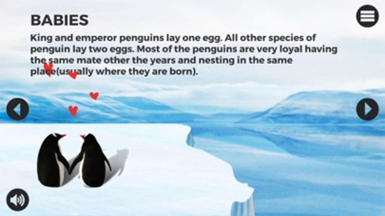Dive in the world of penguins to learn interesting things about them. Swim with them in the ocean, find out what they eat, where do they live and how they communicate. You can listen to their story like an audio book or read by yourself. Tap on penguins or other objects to make sounds or find new info about them.