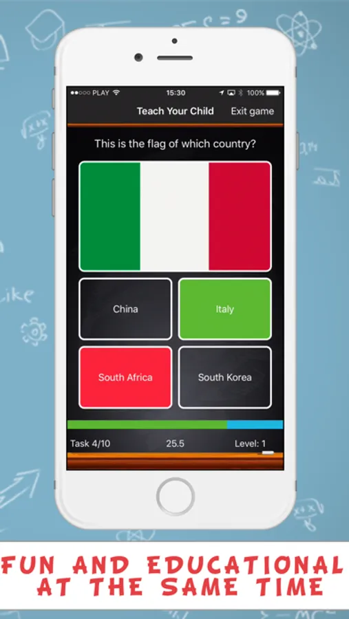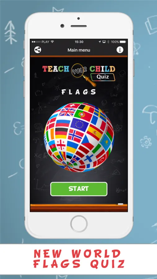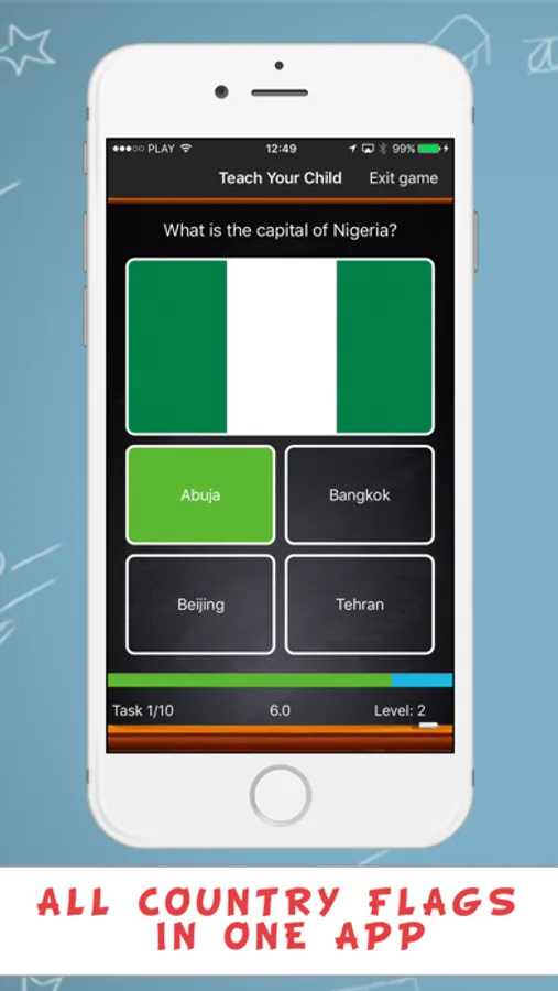 "Teach Your Child Quiz - Flags" is a quiz game that will help you and/or your children memorize all the national flags. Answer the questions quickly and correctly to get more points. This app is addictive and educational at the same time.