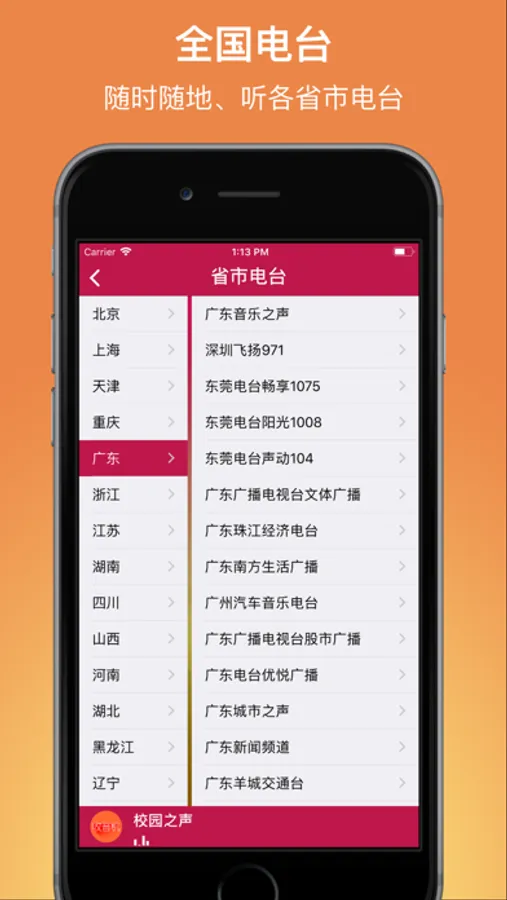 3、最全省市电台:北京、上海、天津、重庆、广东、浙江、湖北等全国各省市以及北上广深的热门电台。