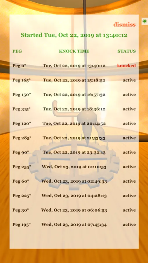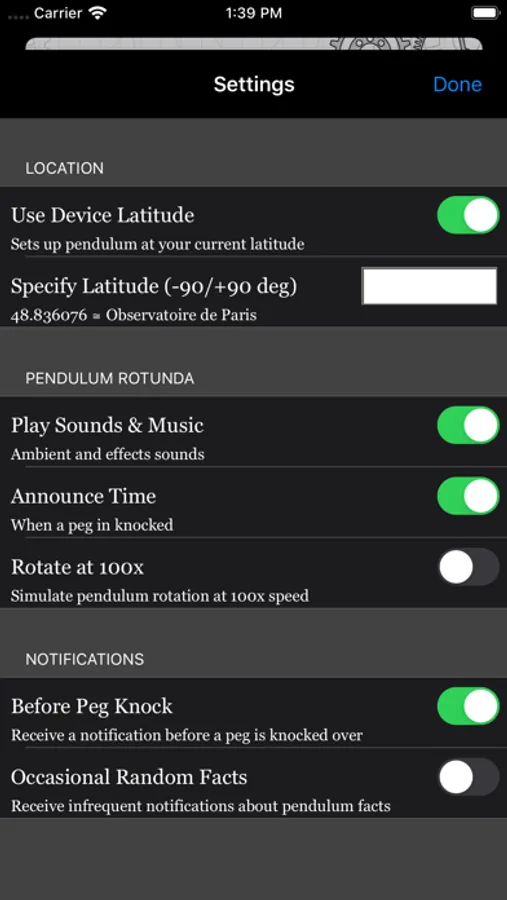 In 1851 French physicist, Léon Foucault, constructed a simple pendulum where at the base, placement of pegs arranged in an arc are struck by the bob as the pendulum rhythmically oscillates above. The plane of oscillation appears to rotate eventually knocking each peg but this effect is that of the Earth rotating underneath. This was the first experiment of its kind that visually demonstrated the rotation of Earth about its axis.