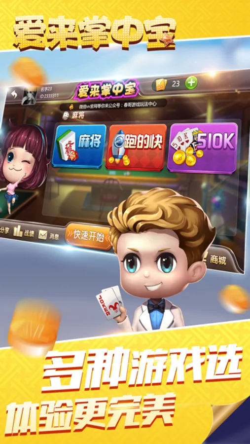 爱来掌中宝是一款休闲类棋牌游戏。时尚简约的棋牌画面,真人实时对战玩法,陪伴您快乐每一天。内含最正宗的福安510K玩法,和朋友约局不在受地域限制,不错哟。