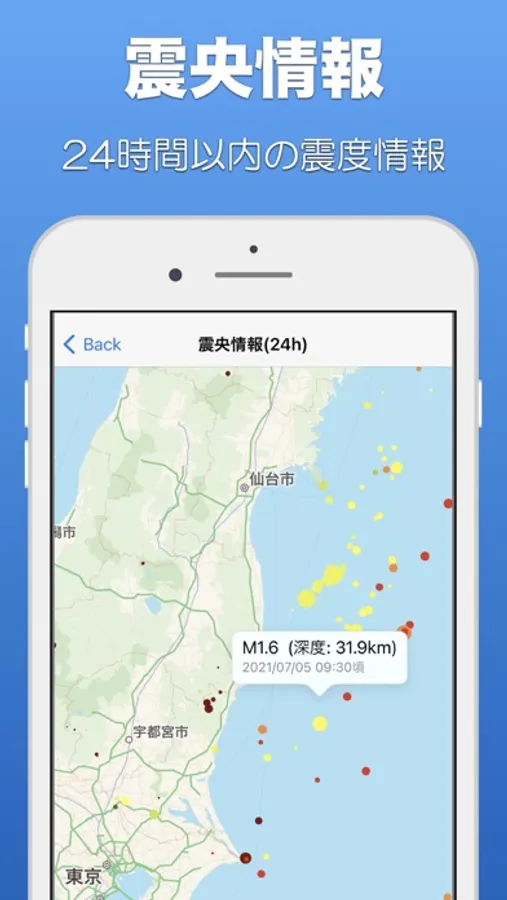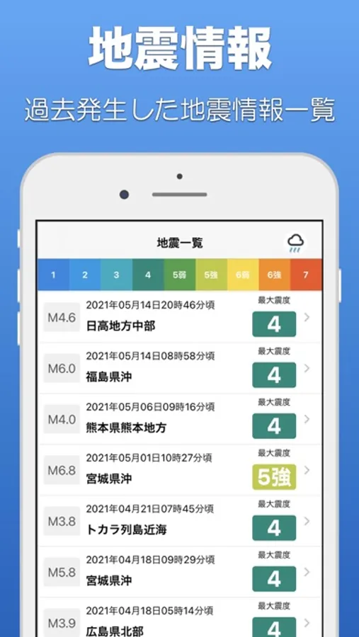 地震発生時など、地震情報(「発生時刻」「震源地」「震度」「マグニチュード」)がアプリ上で確認することが出来ます。