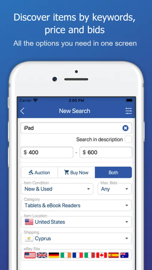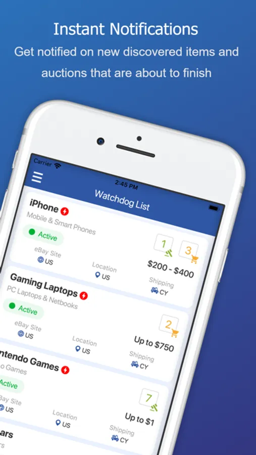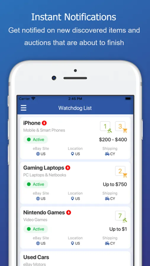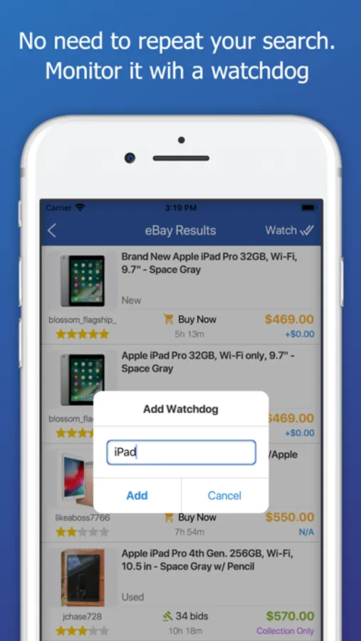Watchdog for eBay is here to help you grabbing the greatest deals without much hassle. Just make your search, define your price limits and you are all set. You will get notified whenever an auction is about to end, and it is still within your price limits, and when new buy-it-now items make their appearance on the web.