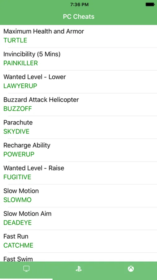 With this app, you can use all the cheats in PC, PlayStation 3 (PS3) , PlayStation 4 (PS4) and XBOX game platforms without needing any internet connection. All GTA Cheats at your fingertips via simple and handy UI.