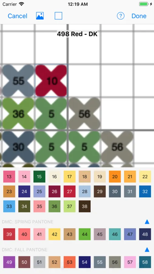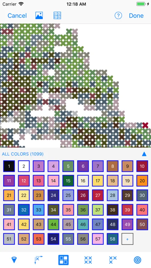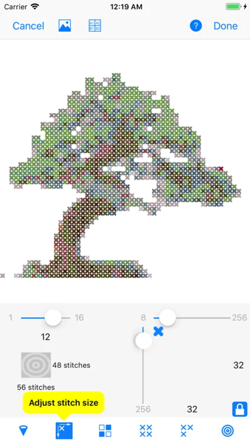 Further refine your patterns by manually changing the color (by tapping on a stitch) and removing stitches (by long pressing on individual stitches).