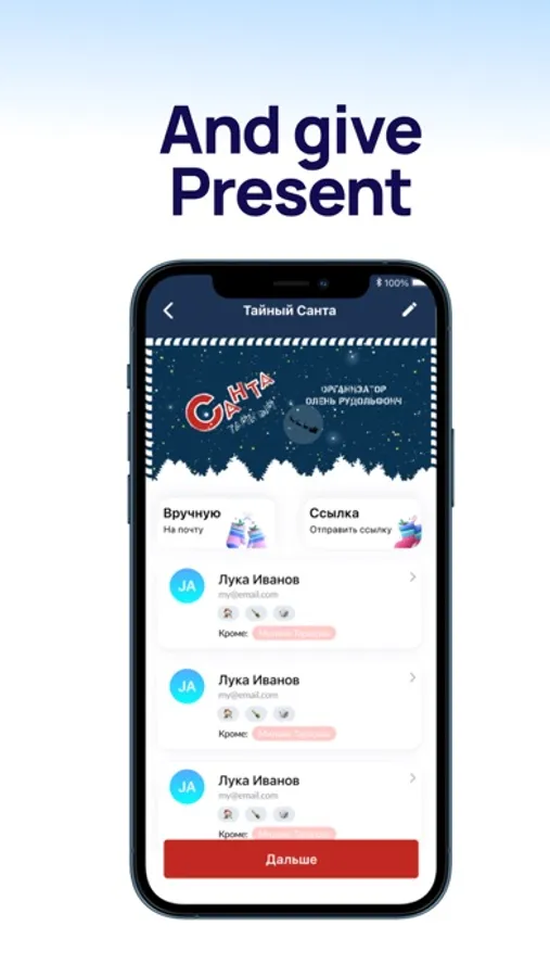 Automated Email Generation: The app automatically generates and sends emails with all the essential information to each Secret Santa. This simplifies the organizational process and lets participants focus on selecting and preparing gifts.