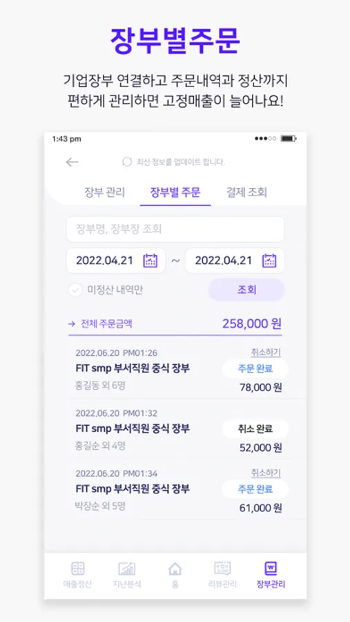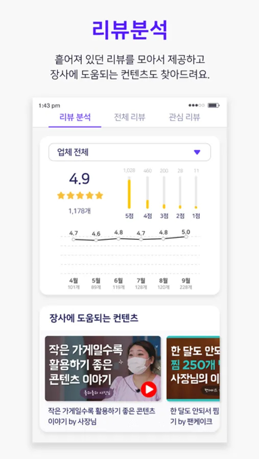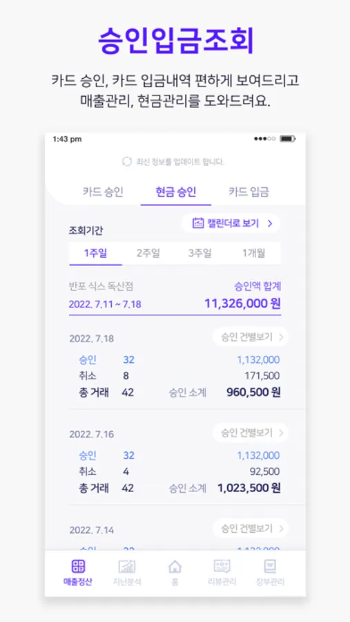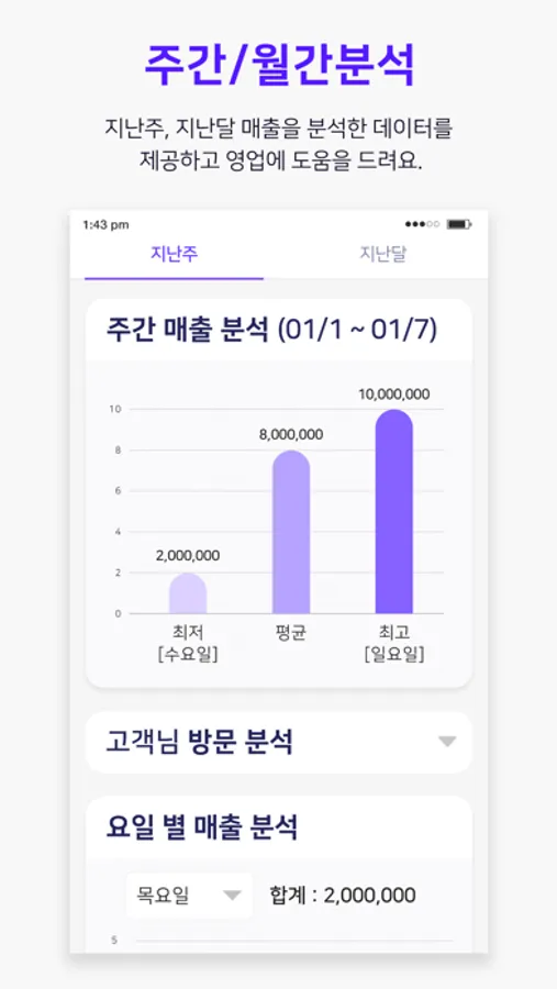 - 주간/월간 분석으로 나의 매장 현황을 확인하고 미래를 계획하세요.