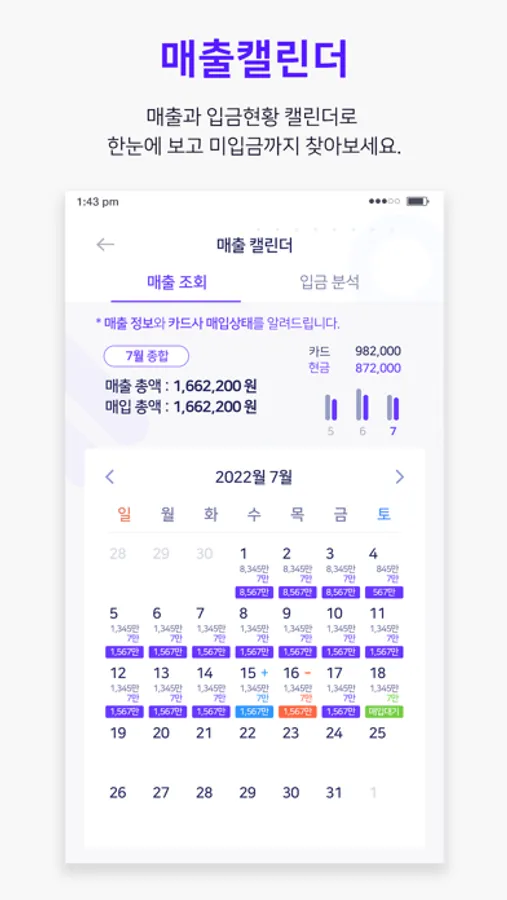 - 캘린더로 한눈에 확인하고 매출 입금관리 정확하게 하세요.