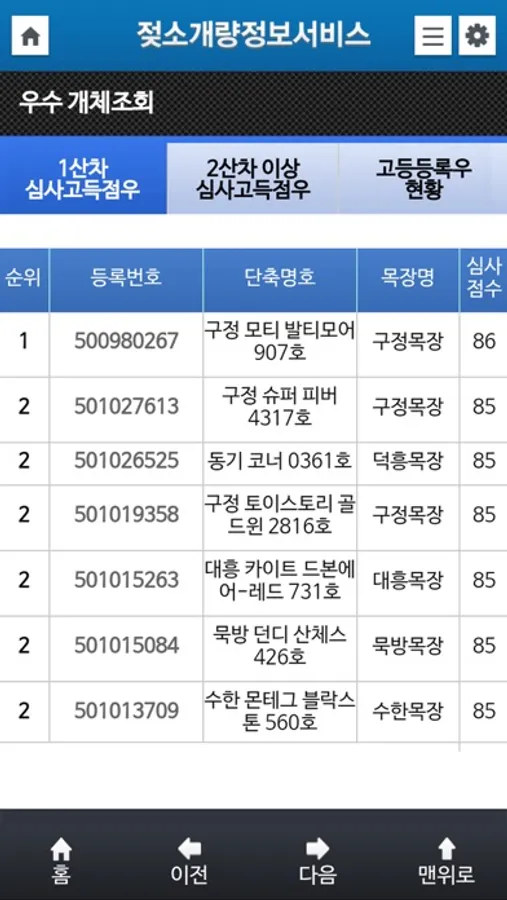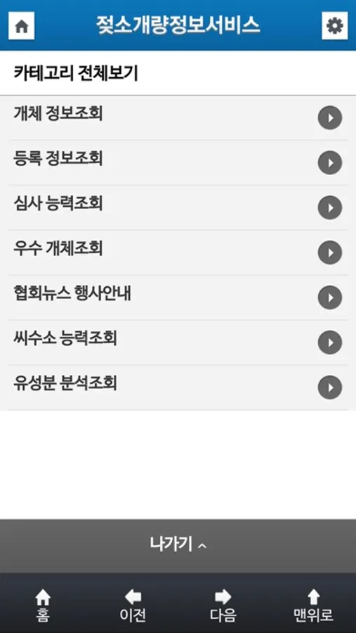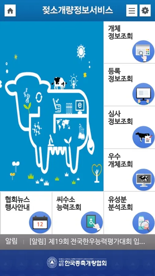 개체정보조회, 등록정보조회, 심사정보조회, 우수개체조회, 유성분석조회, 씨수소능력조회 등 다양한 정보를 스마트폰에서 바로 조회할 수 있습니다.