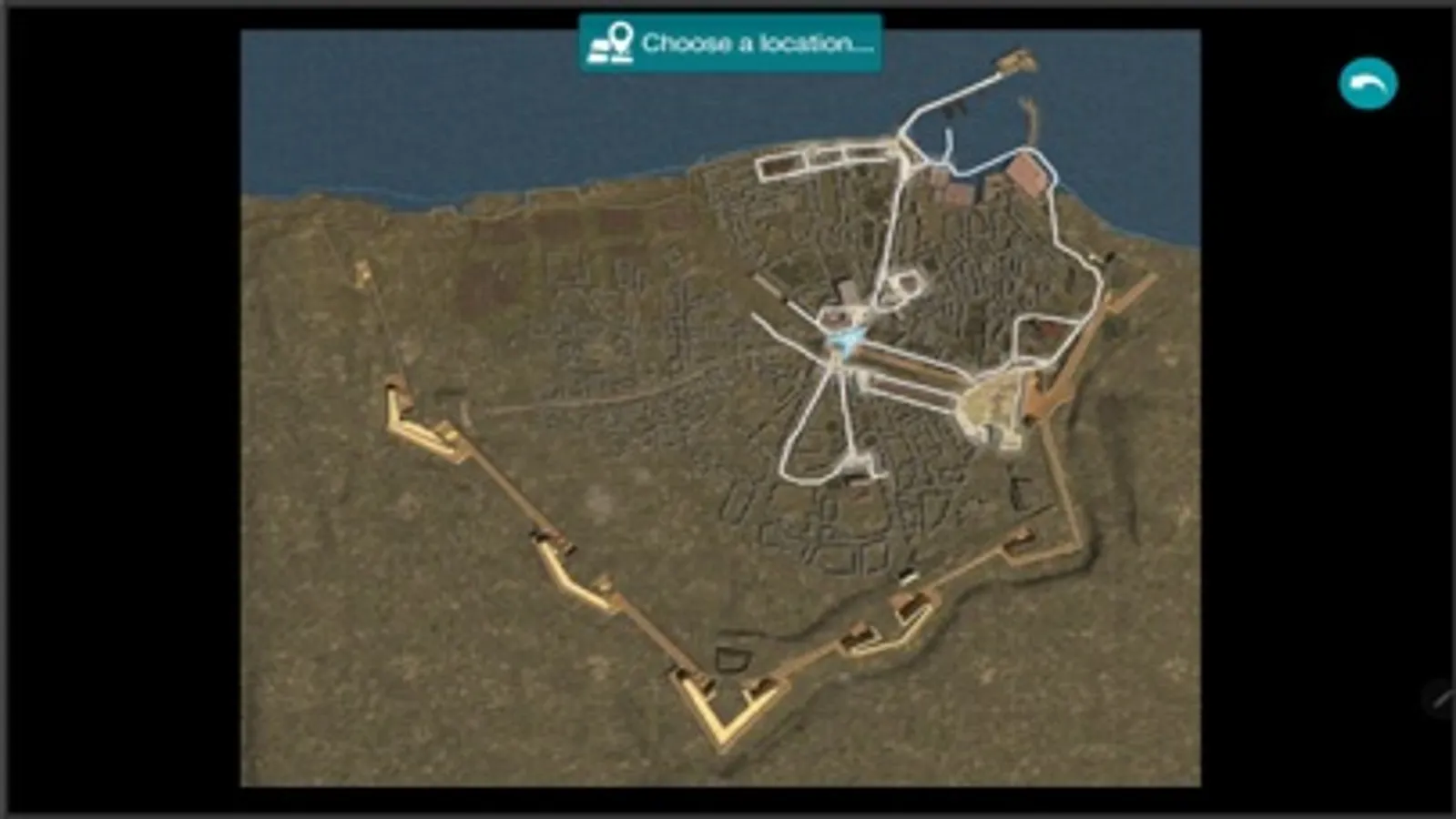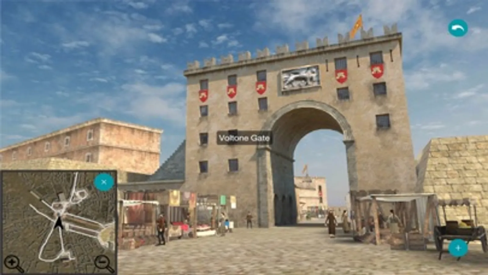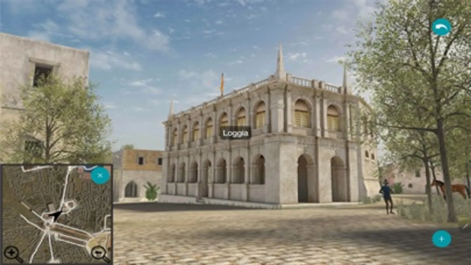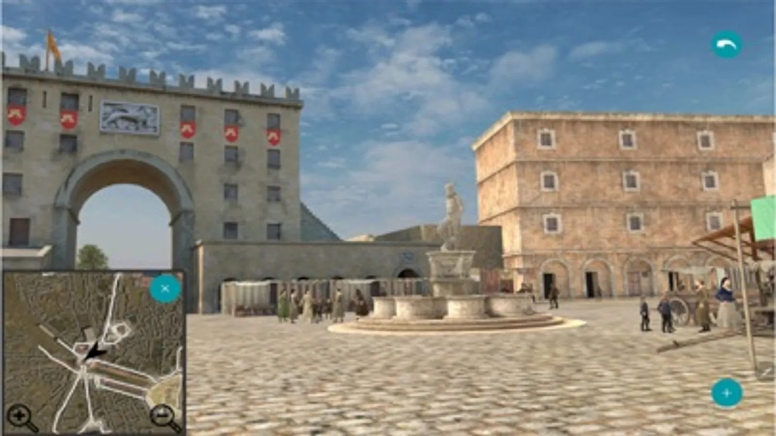 In case that the user is not within the limits of the old city, the application starts from the centre and with the joystick, shown at the bottom of the screen, they can wander around and get to know the city. They can also choose between the ground or “fly over” tour.