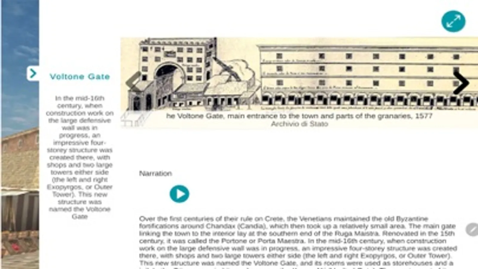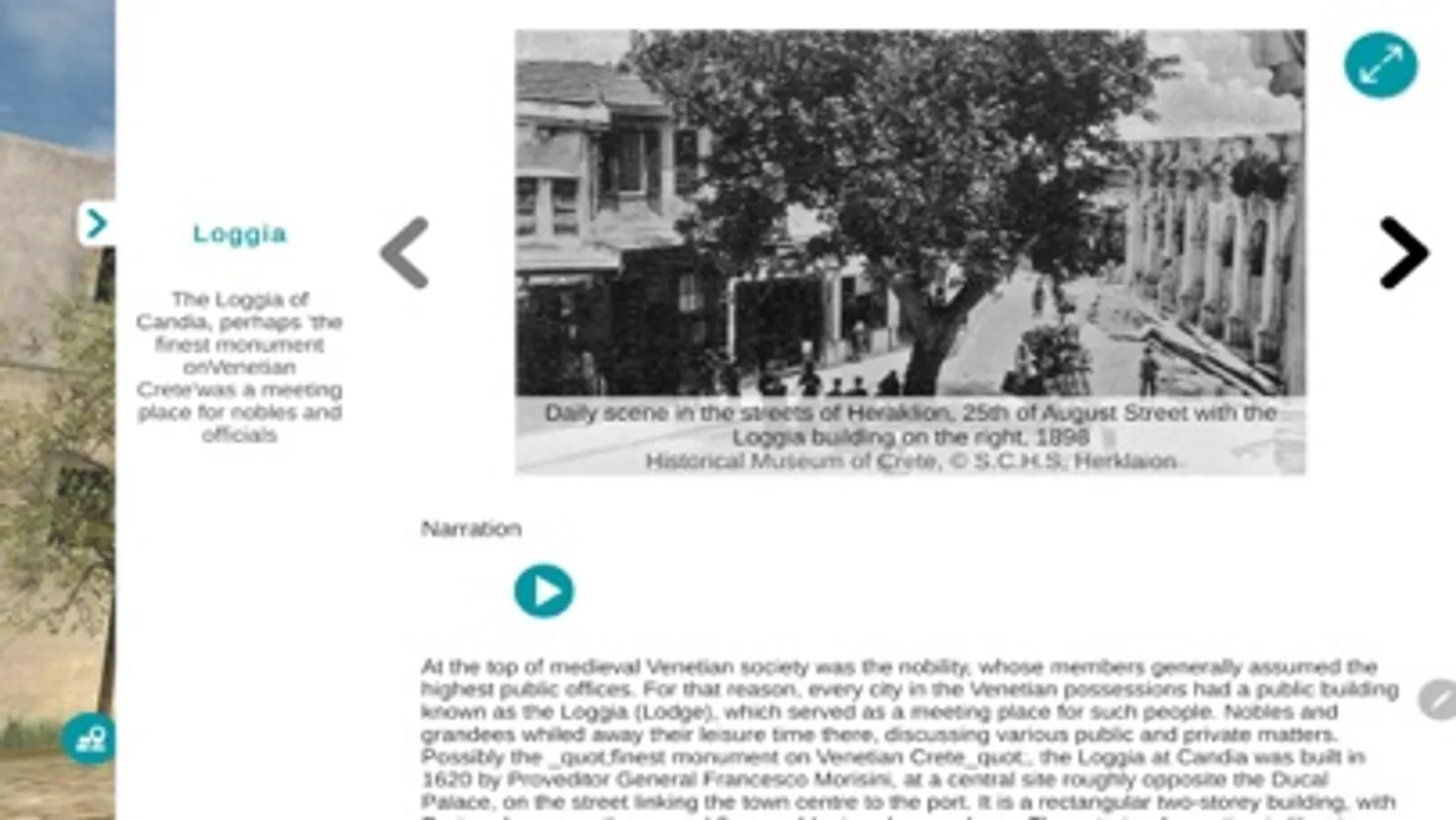 Through forty (40) 3d representations of buildings and the urban tissue of the Venetian period, the user gets a complete – as much as is possible - picture of 1640 Venetian Candia, a little before the Ottoman siege, conquest and domination. The administrative city centre (around the “Lions’ fountain”), the imposing buildings - palaces and government buildings- the magnificent churches and monasteries, the port with the fortress and the arsenals, the fortification walls with the renaissance gates, the elaborate fountains and many other monuments, appear on the screen of the smart mobile devices composing the image of a capital city of Venetian Crete, at its peak.