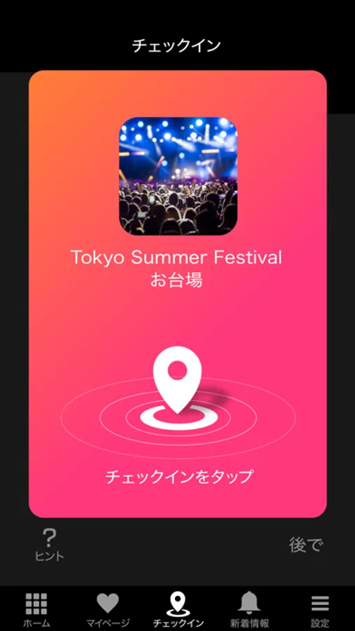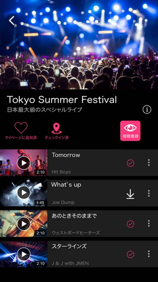 ・本アプリ対象のライブイベントエリアで「チェックインボタン」を押すと、その日その場所にいるイベント参加者しか手に入らない動画を、ダウンロードすることが出来ます。