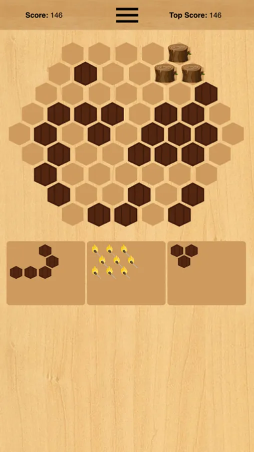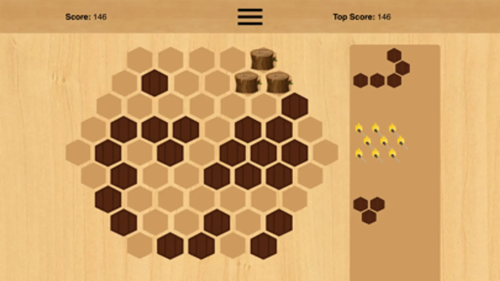 The game features a wooden board and tetromino like wooden hexagon pieces. The objective of the game is to form lines diagonally on the board using the hexagon pieces while avoiding obstacles.