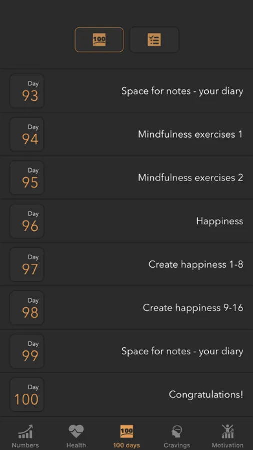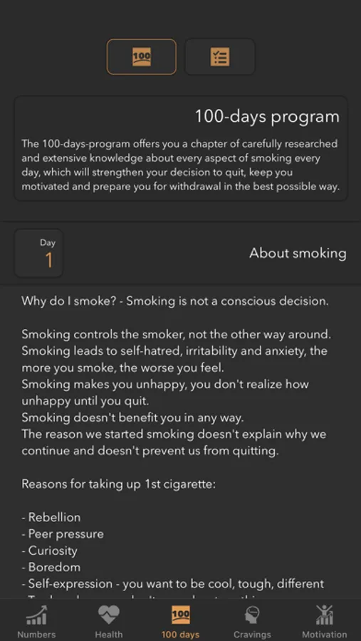 The 100-day program offers you a chapter of carefully researched and extensive knowledge about every aspect of smoking every day, which will strengthen your decision to quit, keep you motivated and prepare you for withdrawal in the best possible way.