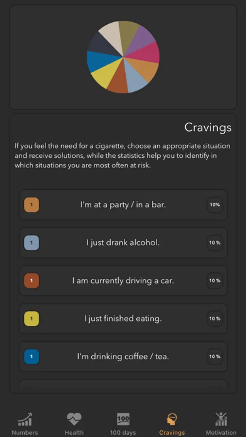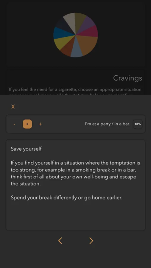 If you want to have a cigarette, you will be shown practical solutions for the respective situations in which you are currently in. Statistics also show you in which situations you are most often at risk, so that you can avoid them or approach them differently in the future.