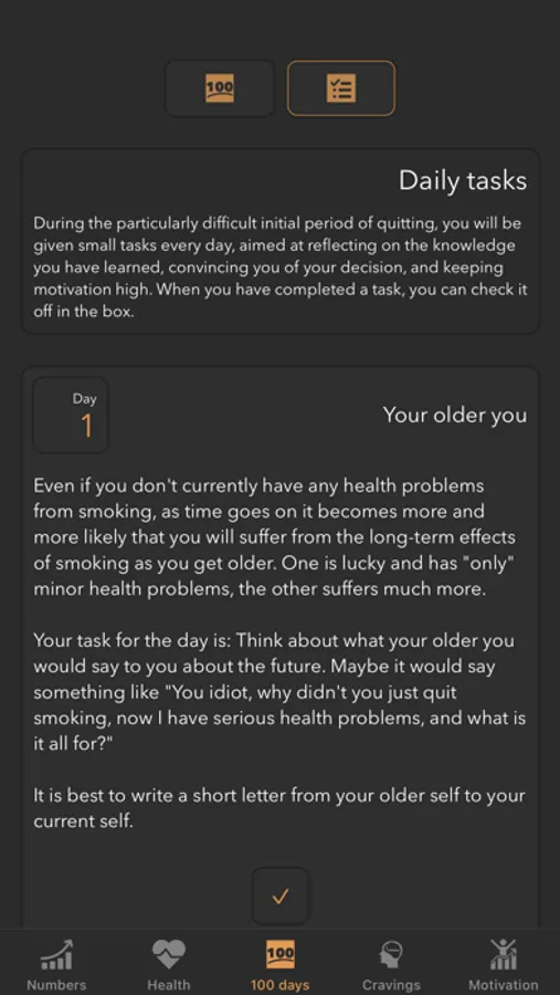 During the particularly difficult initial period of quitting, you will be given small tasks every day, aimed at reflecting on the knowledge you have learned, convincing you of your decision, and keeping motivation high.