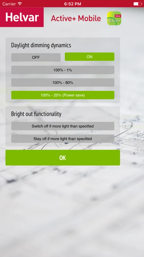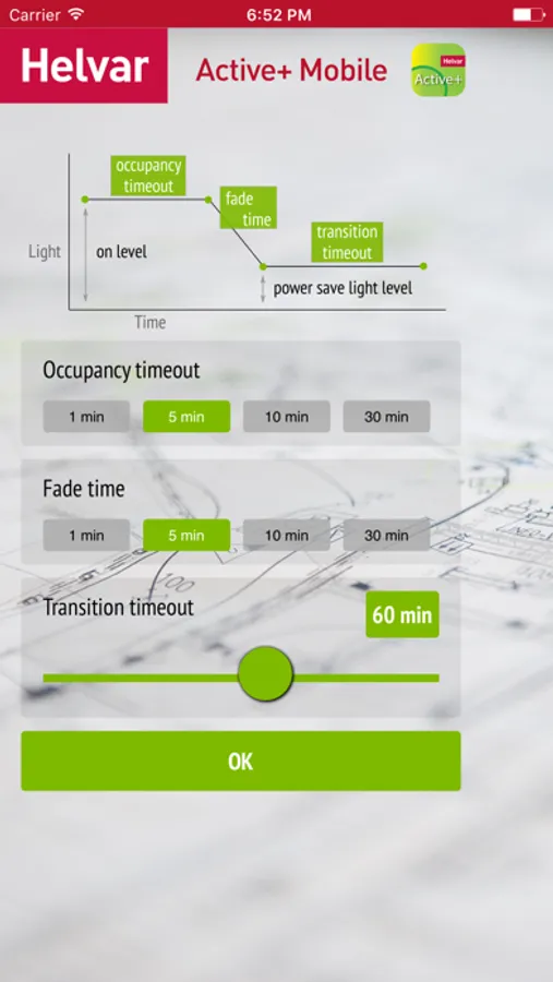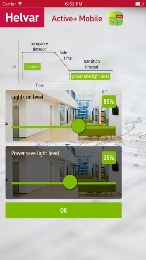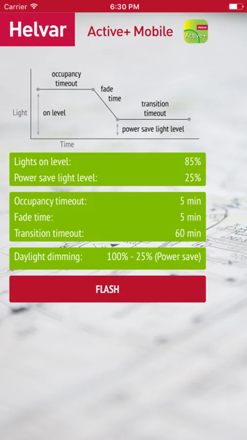 This app is for adjusting settings in the Helvar Active+ lighting solution. To use this app, you must have an approved smartphone running iOS equipped with an LED flash, a luminaire fitted with an Active+ LED driver, and the Active+ Sense sensor. Settings that can be adjusted are: