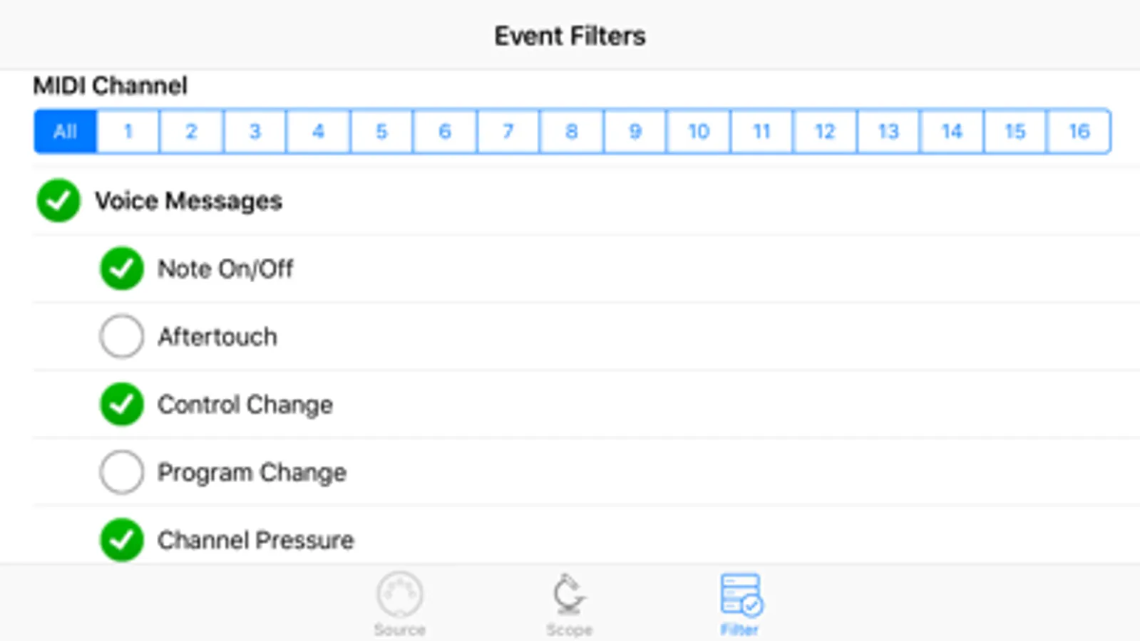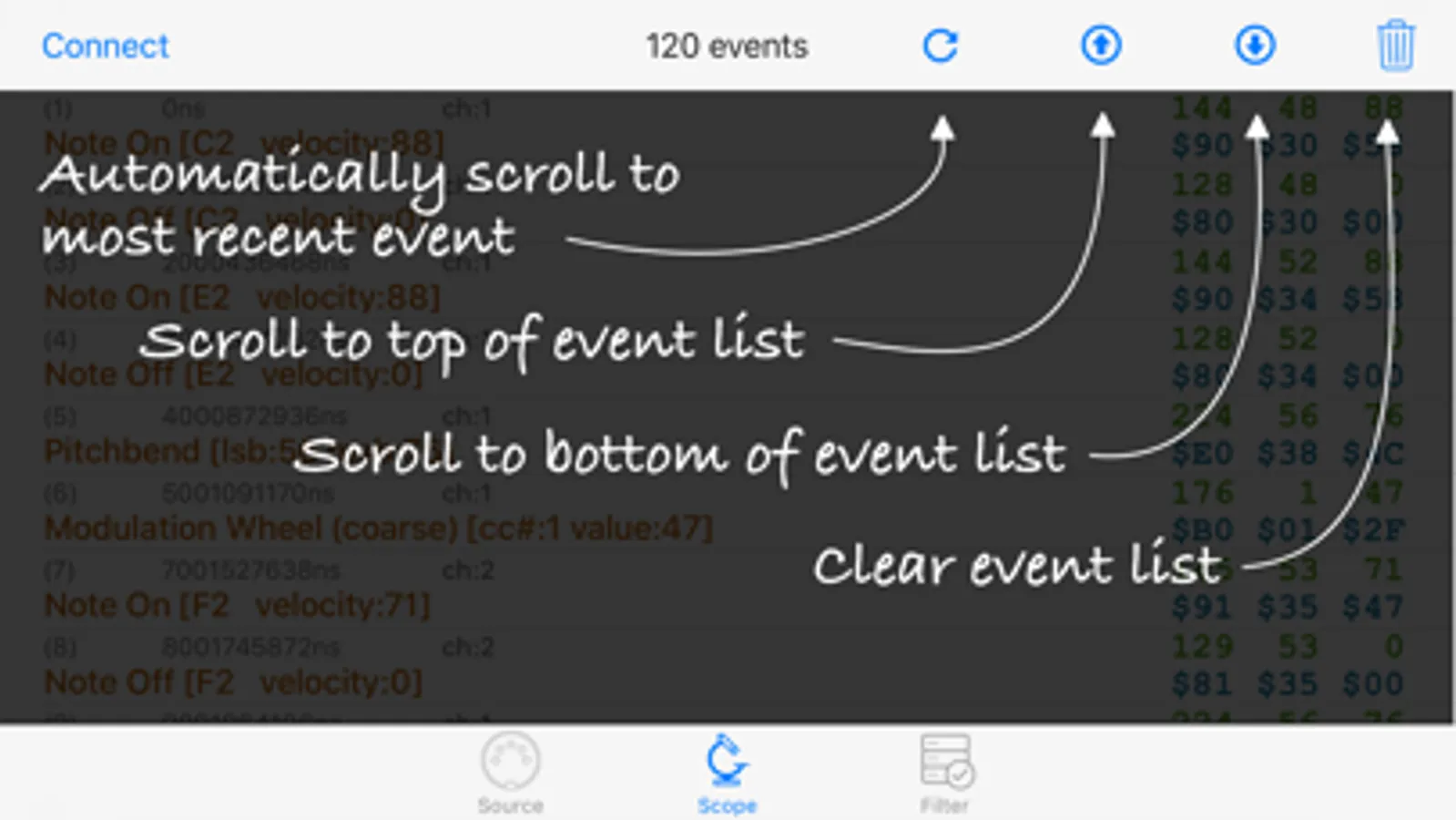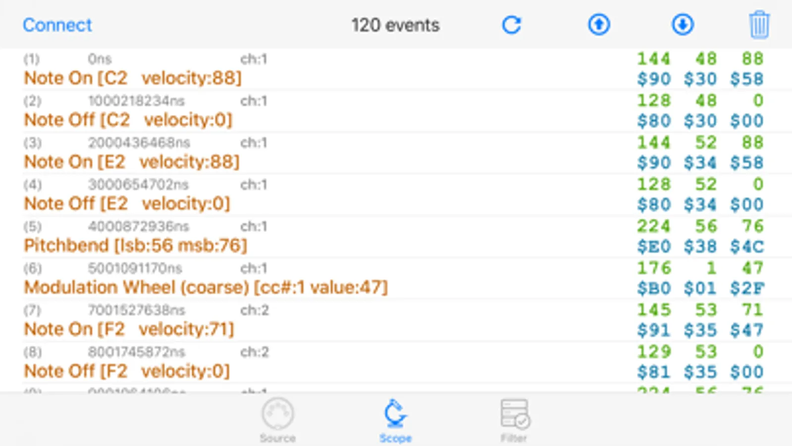 MIDI Scope allows you to monitor MIDI activity using your iOS device. Features include the ability to filter events by individual type or by group as well as MIDI Channel. A comprehensive interpretation of each event packet is displayed. Raw packet data is shown in both decimal and hexadecimal formats. Please send feature requests and trouble reports to the support email listed on our web site. Please rate this app, there is a button on the settings page to make it easy.