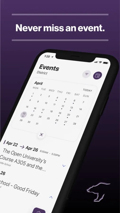 The event section shows a list of events throughout the district. Users can add an event to their calendar to share the event with friends and family with one tap.