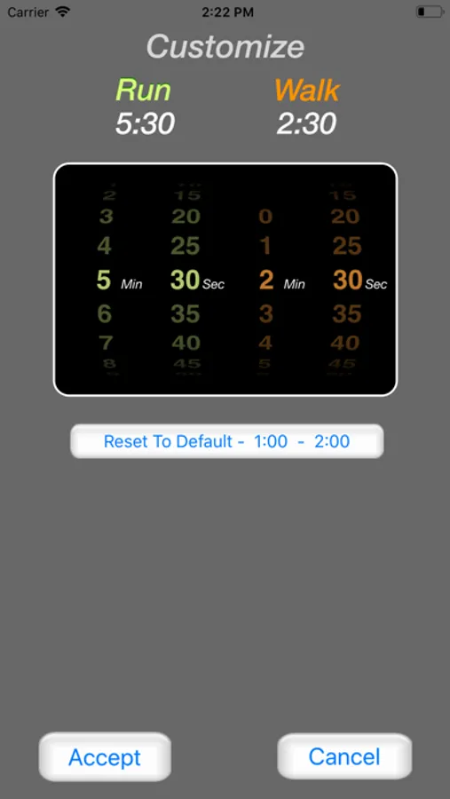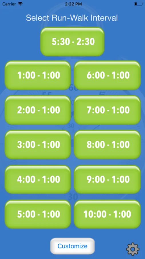 Customization is here! Running Interval Timer Pro allows for customized Run-Walk times for any of the 11 buttons while still keeping the quick easy-to-use style.