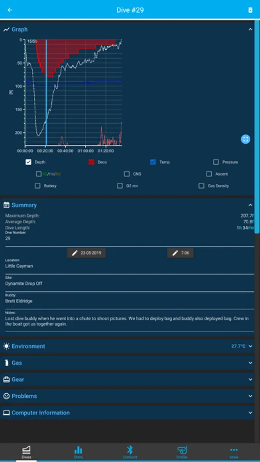 Using Bluetooth LE technology, you can quickly and easily download your dive logs to Shearwater Cloud. Once your logs are downloaded, you can analyze your depth, decompression profile, temperature, and much more.