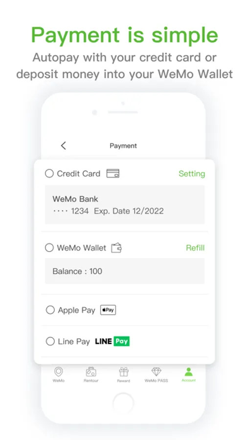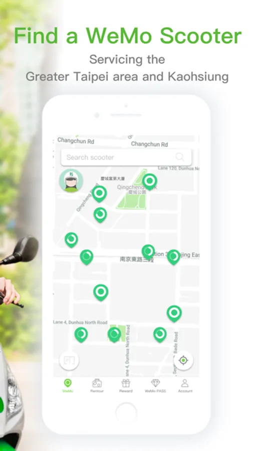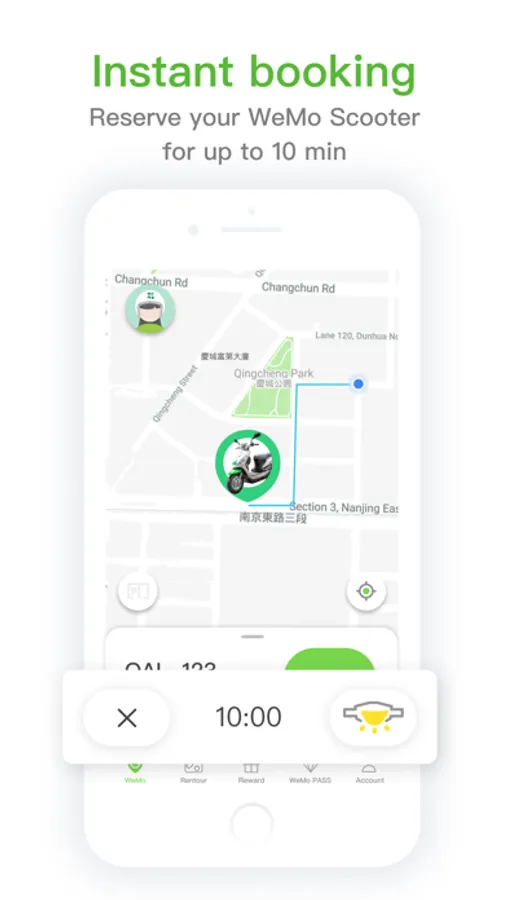 2. Renting:Launch the WeMo Scooter App to find a nearest scooter and reserve it. Turn on your WeMo scooter and open the scooter's trunk, and begin your journey!