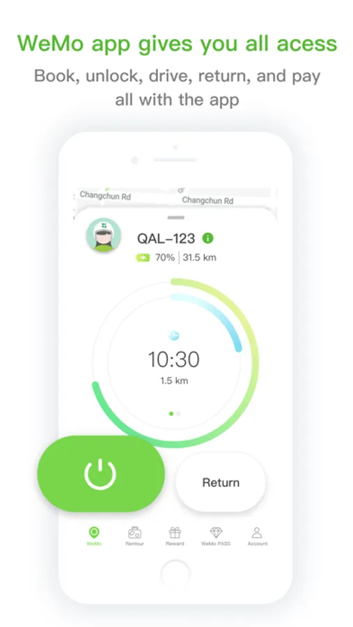 1. Keyless:Your smart phone is the key. Through our app, you can book, rent, turn your WeMo Scooter on and off and even open the trunk.