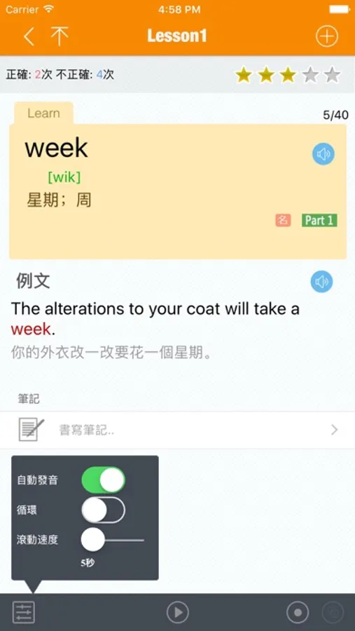 ・錄音功能可以讓您在學習的時候錄下自己的聲音進行照,同時也可以使用備注功能寫下自己對單詞一理解或注釋。