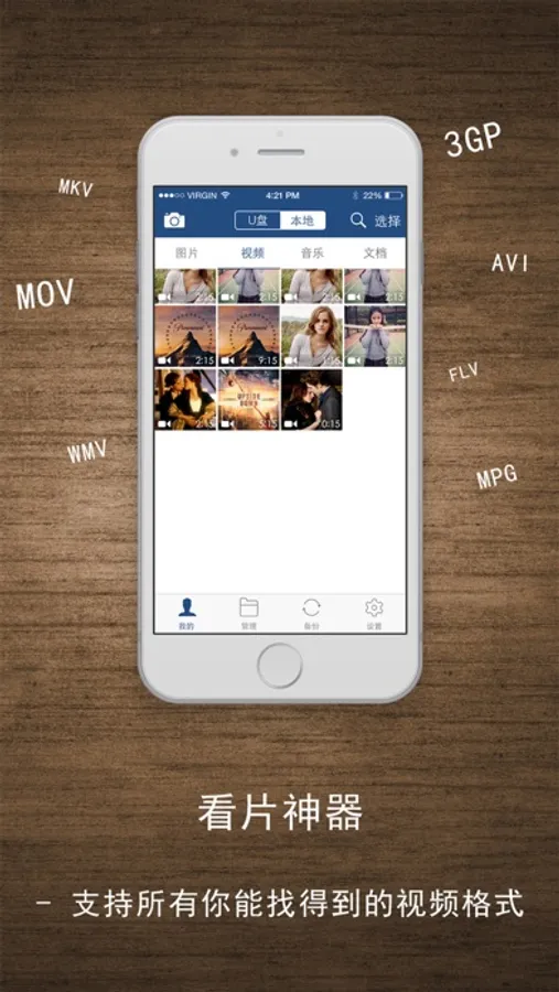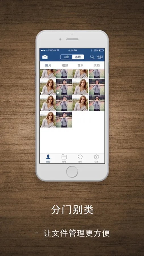 进入App之后,就可以方便的看到手机本地或者U盘上的照片、视频、音乐及文档四类文件。对于这4类文件,iD Disk都有着丰富的格式支持。gif图片、mkv高清视频、m4a无损音频、word文档、PPT等各类文件均可以使用iD Disk App轻松播放或查看。
