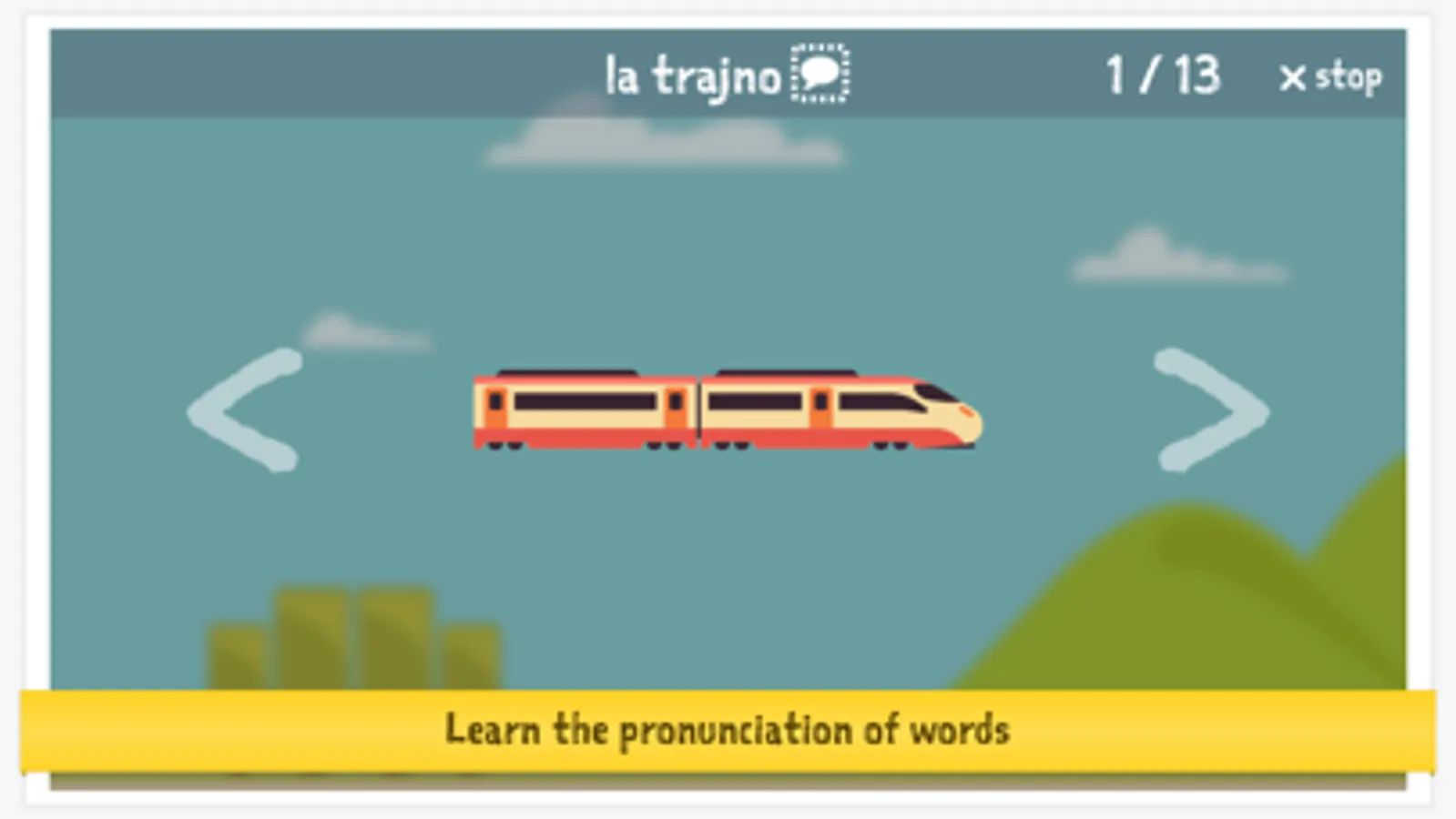 Words: aŭto, trajno, ŝarĝaŭto, aviadilo, biciklo, buso, helikoptero, motorciklo, and 5 more!