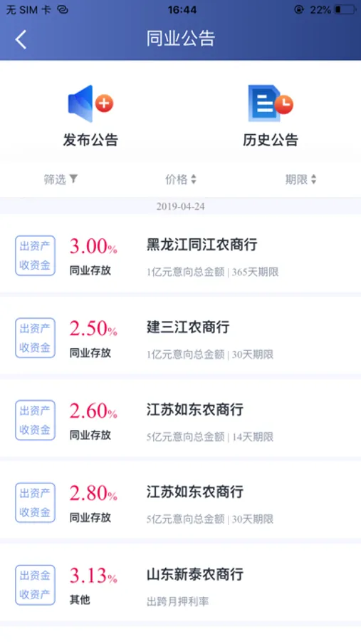 4、公告列表:展示产品详情,实现同业间信息交流。
