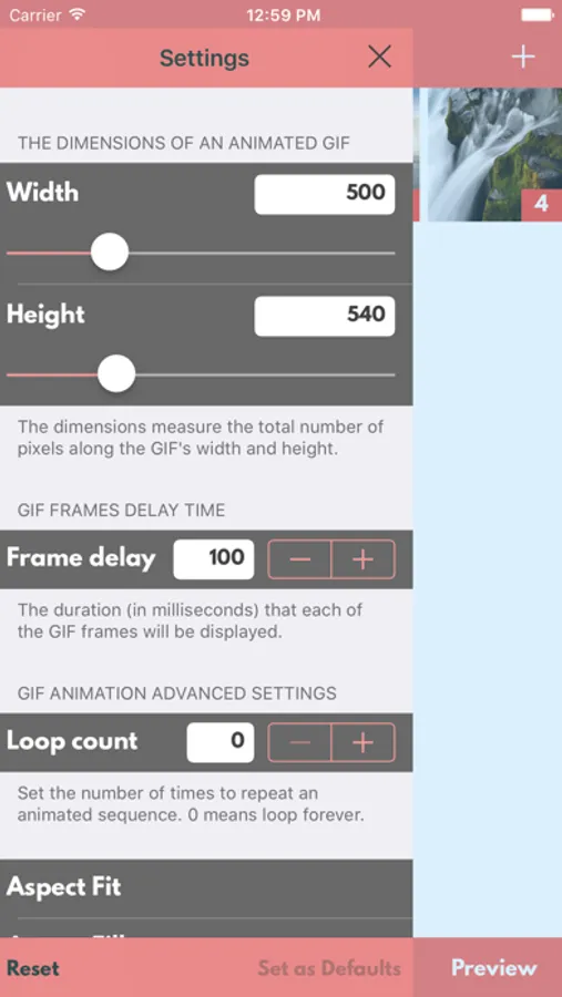 • Control the animation parameters such as: dimensions, frame delay, loop count, content mode etc