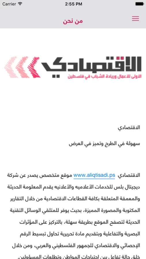الاقتصادي تطبيق متخصص يصدر عن شركة ديجيتال بلس للخدمات الإعلاميه والإعلانيه يقدم المعلومة الحديثة والمعمقة المتعلقة بكافة القطاعات الاقتصادية من خلال التقارير المكتوبة والمصورة المميزة، بحيث يوفر للمتلقي الوسائل التقنية الحديثة لتصفح التطبيق بطريقة سهلة، بالتركيز على المؤثرات البصرية والتفاعلية وبتقديم مادة تحريرية تحاول تبسيط الرقم الإحصائي والاقتصادي للجمهور الفلسطيني والعربي، ومن خلال خلق حالة تفاعل بين احتياجات المواطن وتطلعات المسؤولين.