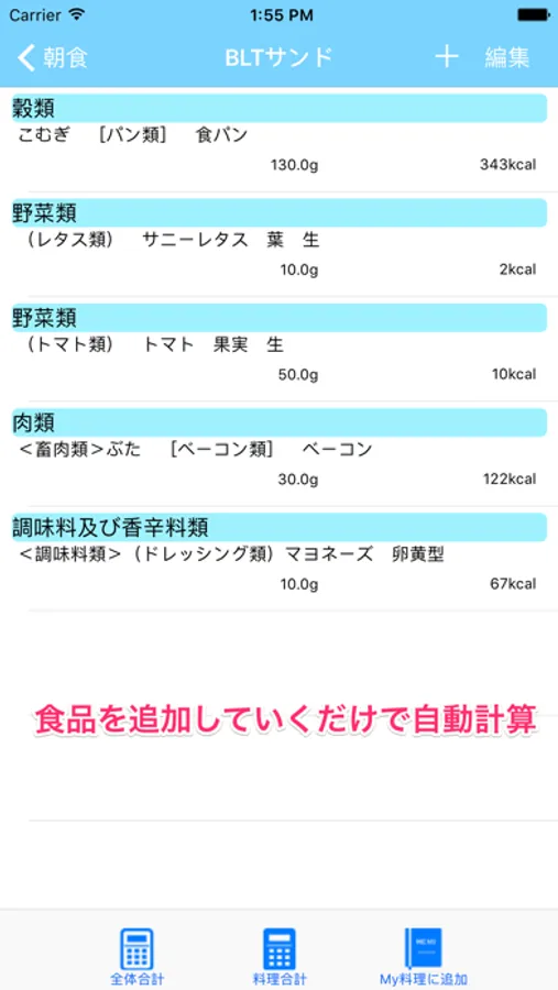 ・食品を検索して数量を決定、登録するだけで自動的に各栄養素の量、合計が計算されます。