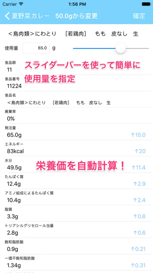 食品を検索、登録するだけで栄養計算を行います。数量の指定は直接入力またはスライダーバーで行います。
