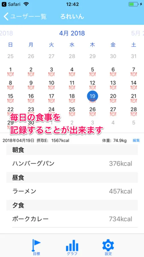「全体」「区分(例えば「朝食」)」「料理(例えば「カレーライス」)」単位で合計や目標充足率を計算できます。