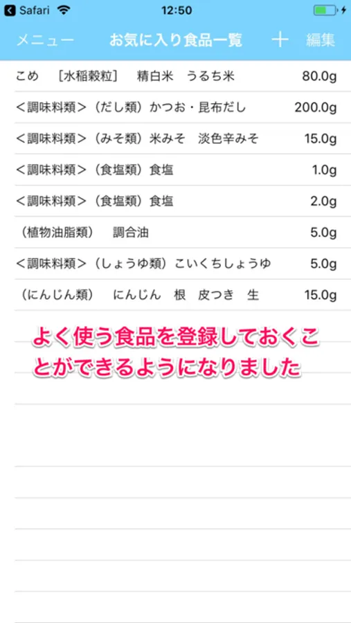 よく使う食品をあらかじめ登録しておくことで、成分表検索なしで使用できます。