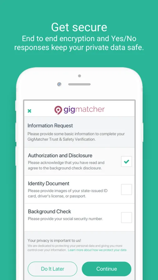 GET SECURE: Evident protects your information with end-to-end encryption ensuring that information is accessible only to you. And when you choose to share your information, often a simple “yes” or “no” is all that has to be communicated. With Evident, there is no need to constantly provide your private information to others.