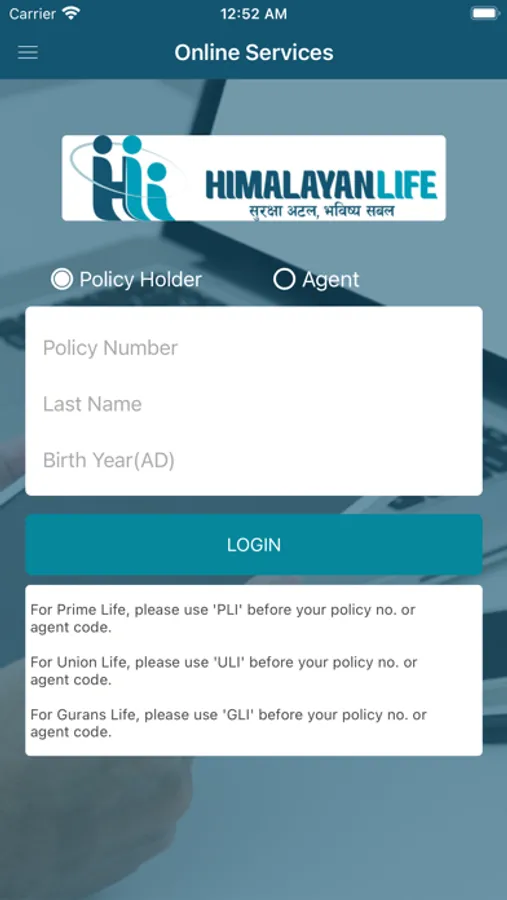 • Login section is only for agents and policy holders. These users will have the ability to view the information of their dealing and transaction history of their individual policies