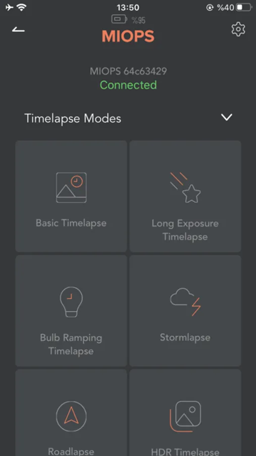 The MIOPS MOBILE application utilizes the smartphone's capabilities to offer creative modes like Vibration, Sound, Motion and Distance or even various Timelapse modes to trigger your camera. It also provides basic shutter release modes like Press&Hold, Press&Lock, Timed Release, Self Timer and HDR. The most extra ordinary feature is what we call "Scenario" mode which combines any of the available trigger options to create magic. Moreover, you can schedule your desired mode or sequence to fire at any time while you step back and enjoy your life.