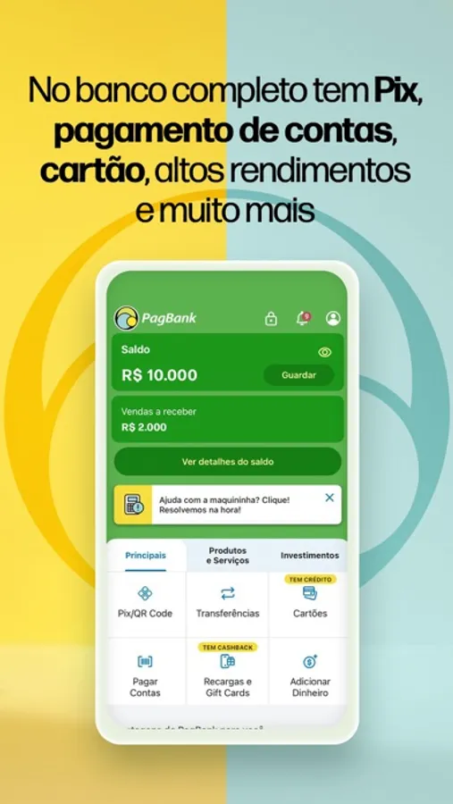 No super app do PagBank você tem uma conta digital para realizar todas as movimentações financeiras e uma conta pj grátis para sua empresa.