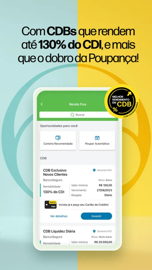 Temos CDBs que rendem mais que o dobro da poupança e com liquidez diária, tesouro direto, fundos de investimentos com cashback, ações e muito mais e que estão disponíveis para Pessoa Física e para Pessoa Jurídica!