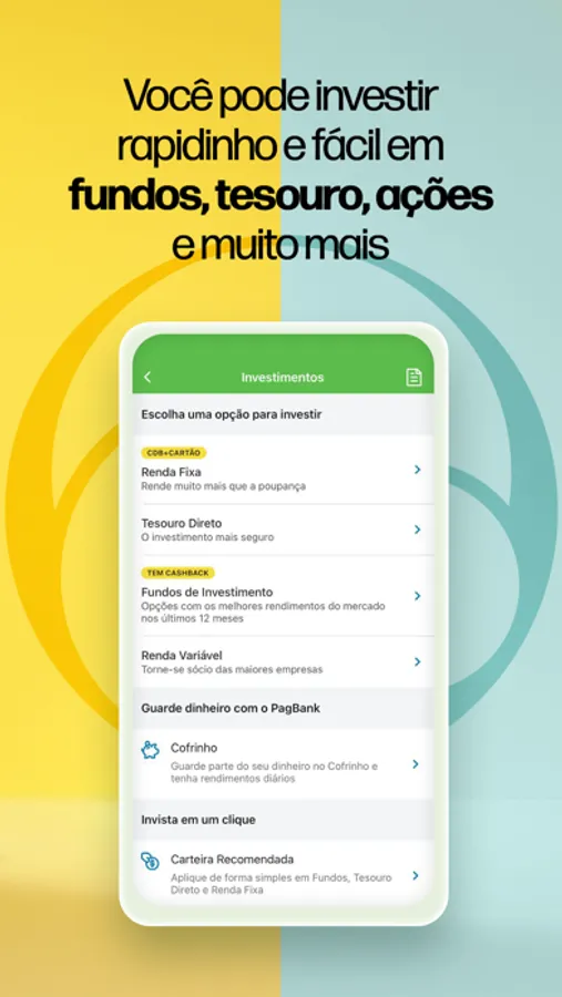 Invista em CDBs que rendem mais que o dobro da poupança e com liquidez diária, tesouro direto, fundos de investimentos com cashback, ações e muito mais no app.