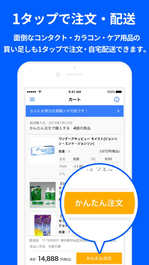 店舗でご登録いただいた情報と前回ご購入の商品情報を使って、前回購入したコンタクト・カラコン・ケア用品をかんたんに注文・配送ができます。